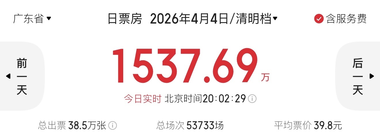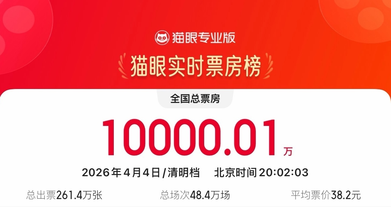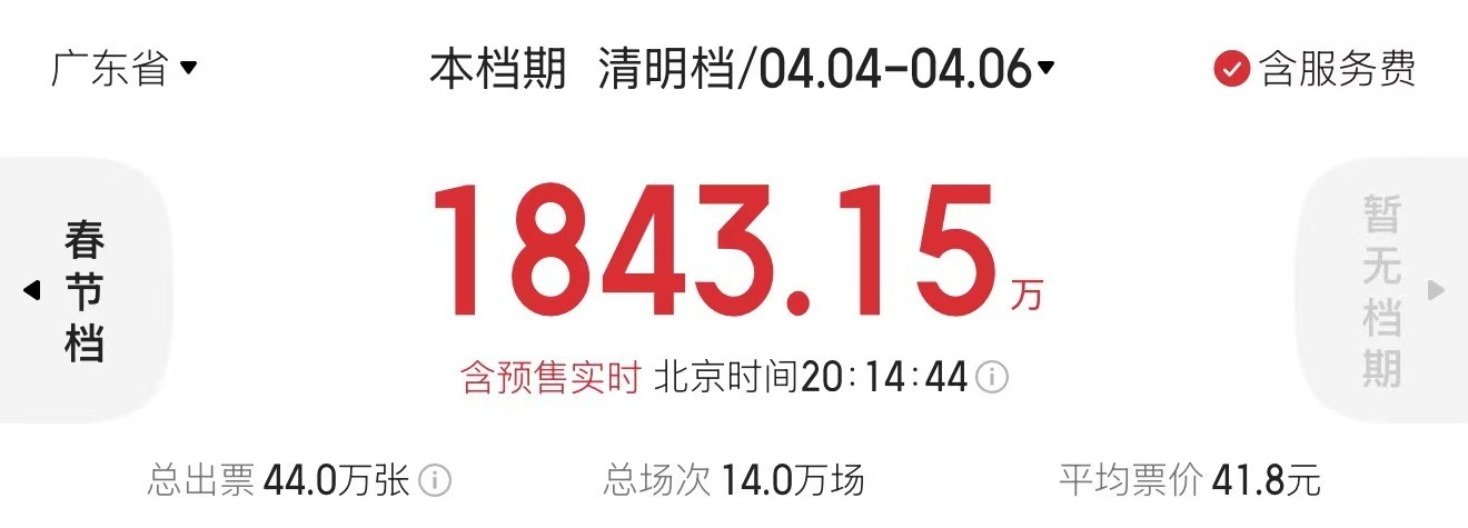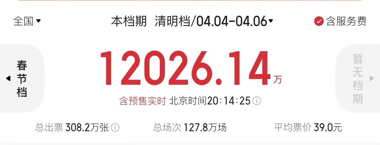 与此同期,2026年晴明档(4月4日—6日)总票房(含预售)禁闭1.2亿元,总不雅影东说念主次超308万,总放映场次达127.8万。广东省晴明档总票房已超1800万元,稳居宇宙“第一票仓”。