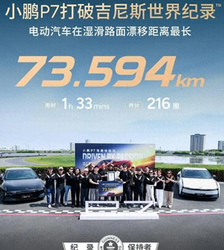 4月27日音信,小鹏汽车官方刚刚通知,小鹏P7轻率了电动汽车在湿滑路面漂移距离最长吉尼斯天下记录:距离73.594km、用时1小时33分钟、悉数216圈。