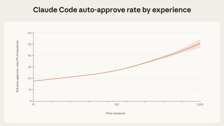 刚运行用Claude Code的东谈主,独一梗概20%的会话聘请了「全自动批准」形式——也就是让AI我方跑,毋庸每一步齐等东谈主点头。