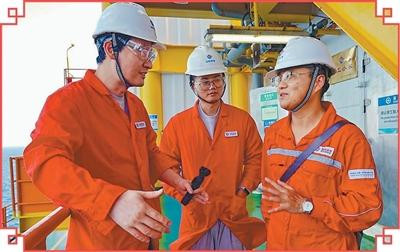 本报场合部记者宋飞(左)、海南分社记者董泽扬(中)在深海一号采访。