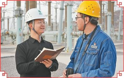 本报甘肃分社记者宋朝军(左)在曲子变电站采访运维人人。