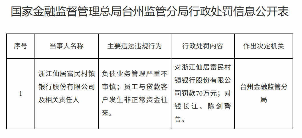 2月28日,国度金融监督解决总局台州监管分局行政处罚信息公开表清晰,开云体育app浙江仙居富民村镇银行股份有限公司因欠债业务解决严重不审慎;职工与贷款客户发生非普通资金来回被罚金70万元。包袱东谈主钱某江、陈某被劝诫。