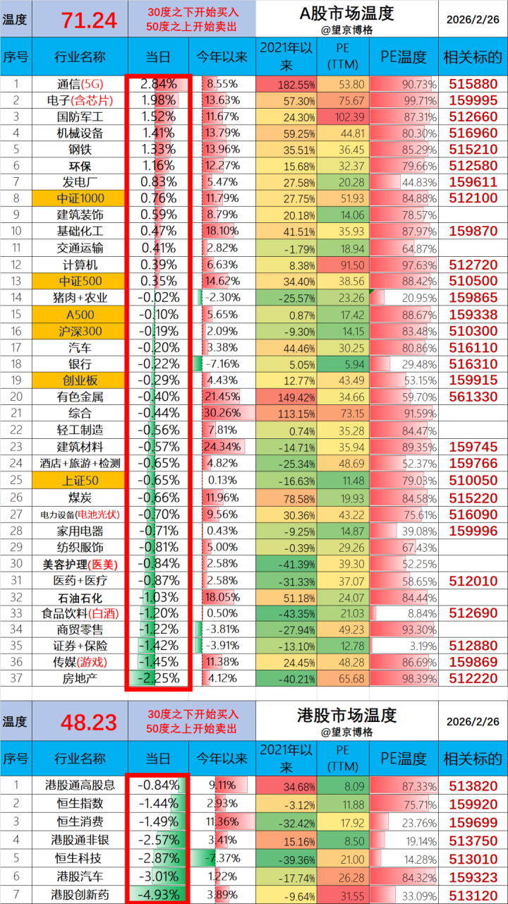 [博格的市集温度计]由「申万31个行业+6个宽基指数」综共筹办得出,上图细分列表中的PE温度,对应的是该行业/宽基的细分温度值。