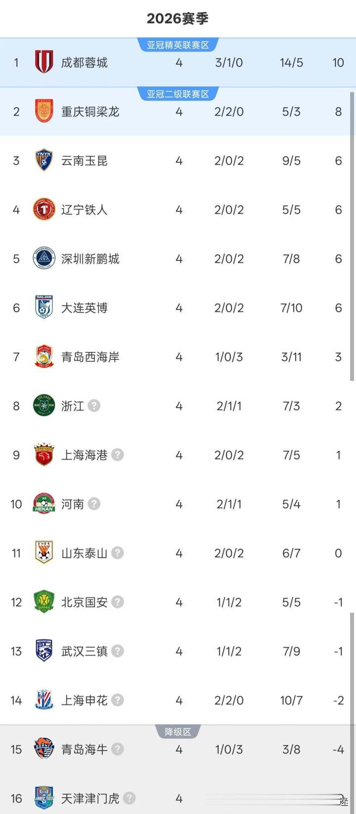 4轮事后的积分榜,排在前二的成皆蓉城和重庆铜梁龙保捏着不败,成皆蓉城积10分不息领跑,重庆铜梁龙则积8分再行回到次席,两队仅有2分之差。云南玉昆、辽宁铁东说念主、深圳新鹏城以及大连英博则同积6分,分列积分榜第3至第6。