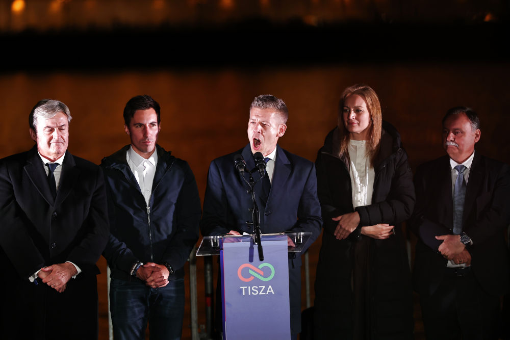 4月12日,在匈牙利齐门布达佩斯,匈牙利蒂萨党携带东说念主毛焦尔·彼得(中)在胜选晚会上语言。新华社发(鲍洛格·达维德摄)