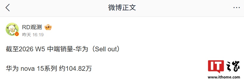 IT之家 2 月 11 日音讯,据博主 @RD不雅测 共享,收敛 2026 年第五周,华为 nova 15 系列手机的累计销量冲突百万(约 104.82 万)。