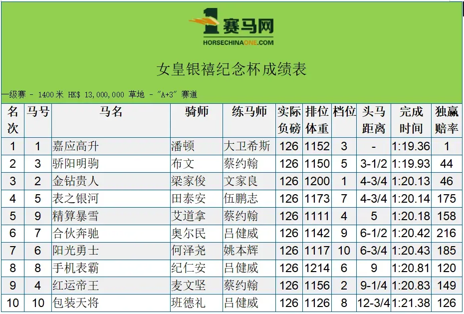本届女皇银禧回归杯通盘参跑马均负126磅出赛。除“嘉应高升”外,同场敌手还包括“金钻贵东说念主”、“骄阳明驹”、“走时君王”、“表之星河”、“阳光豪杰”、“结伙疾驰”、“手机表霸”、“精算暴雪”及“包装天将”等10匹实力赛驹。