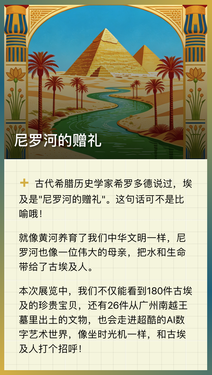 诸位小一又友、大一又友,大家好!宽贷来到“尼罗河的赠礼——古埃及文物与数字艺术展”!我是今天的“小小教练员”XXX。