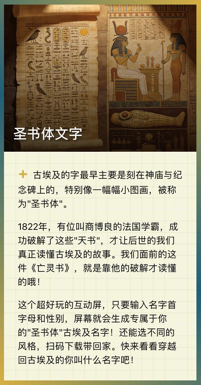 终末要先容的是这个超好玩的互动屏,大家不错亲手“当一次古埃及东说念主”——唯有输入名字首字母和性别,屏幕就会生成专属于你的“圣书体”古埃及名字!还能选不同的作风,扫码下载带回家。