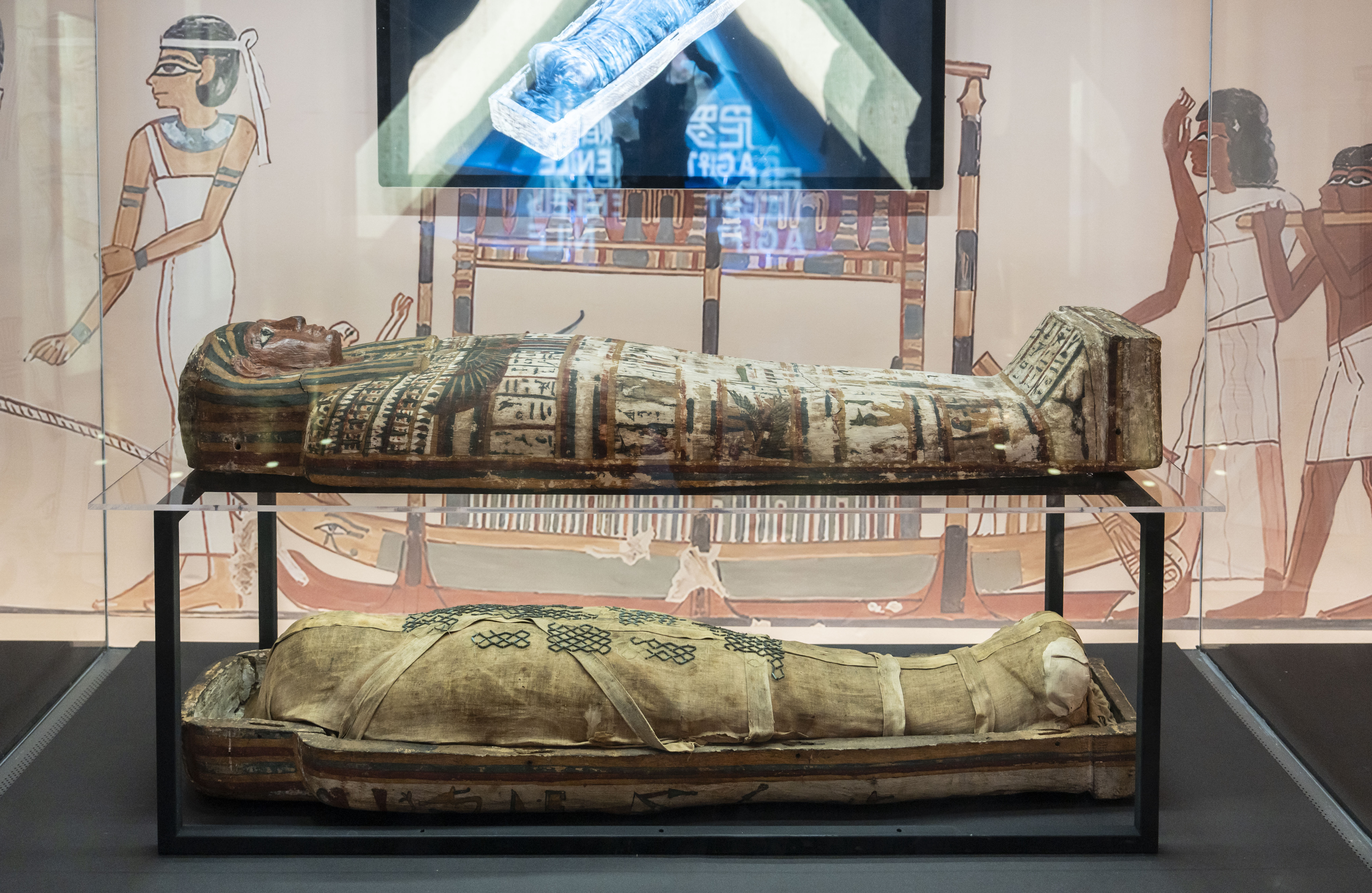先来望望这位“远说念而来的来宾”——塞萨贝鲁的木乃伊和他的棺椁。掌握还有一尊“东说念主面小鸟”雕像,它叫“巴鸟”。古埃及东说念主信服,东说念主物化后,灵魂不错造成小鸟摆脱遨游,最终和躯壳谄谀。
