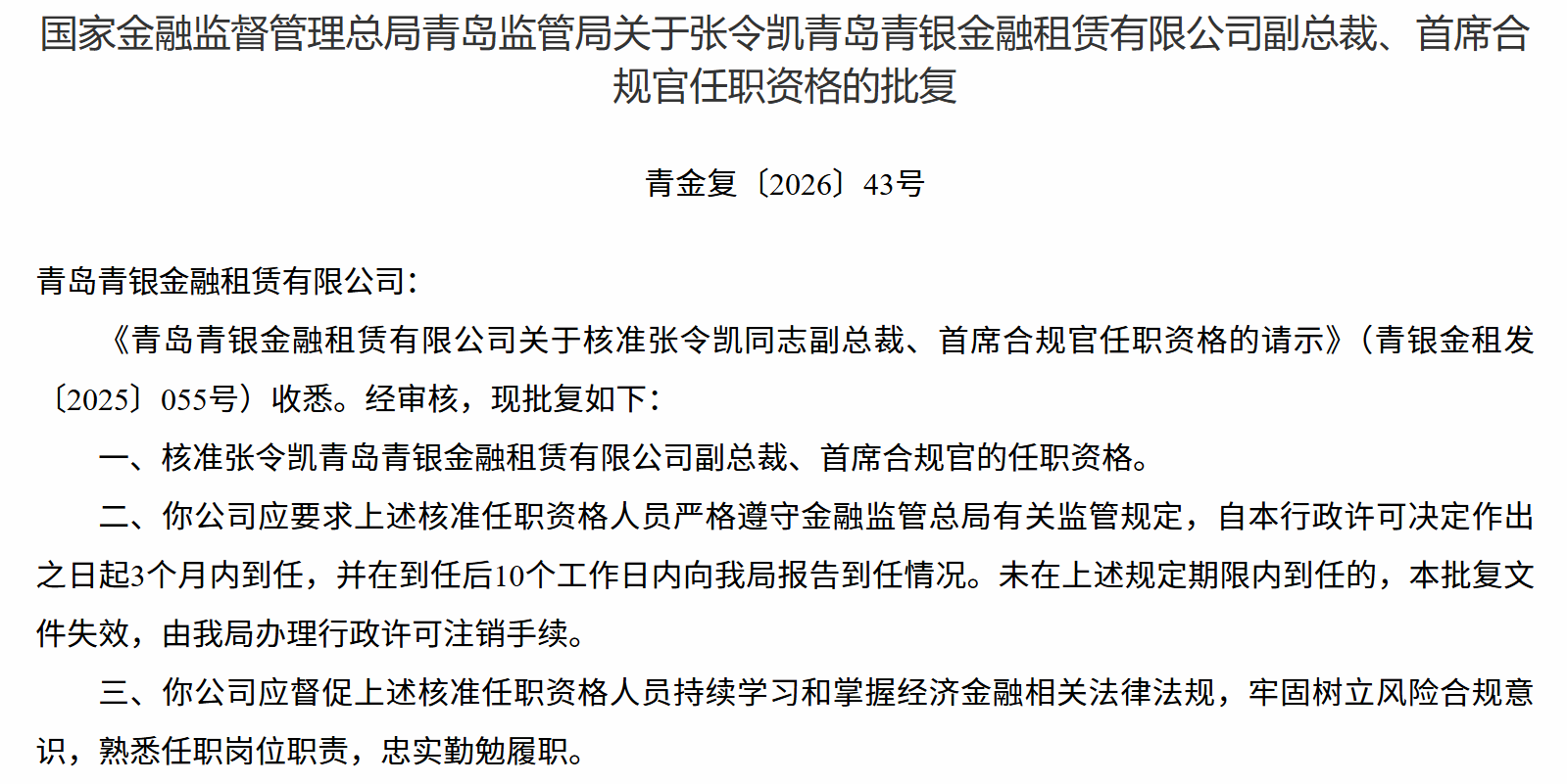 开云体育 张令凯获批担任青岛青银金融租出有限公司副总裁、首席合规官