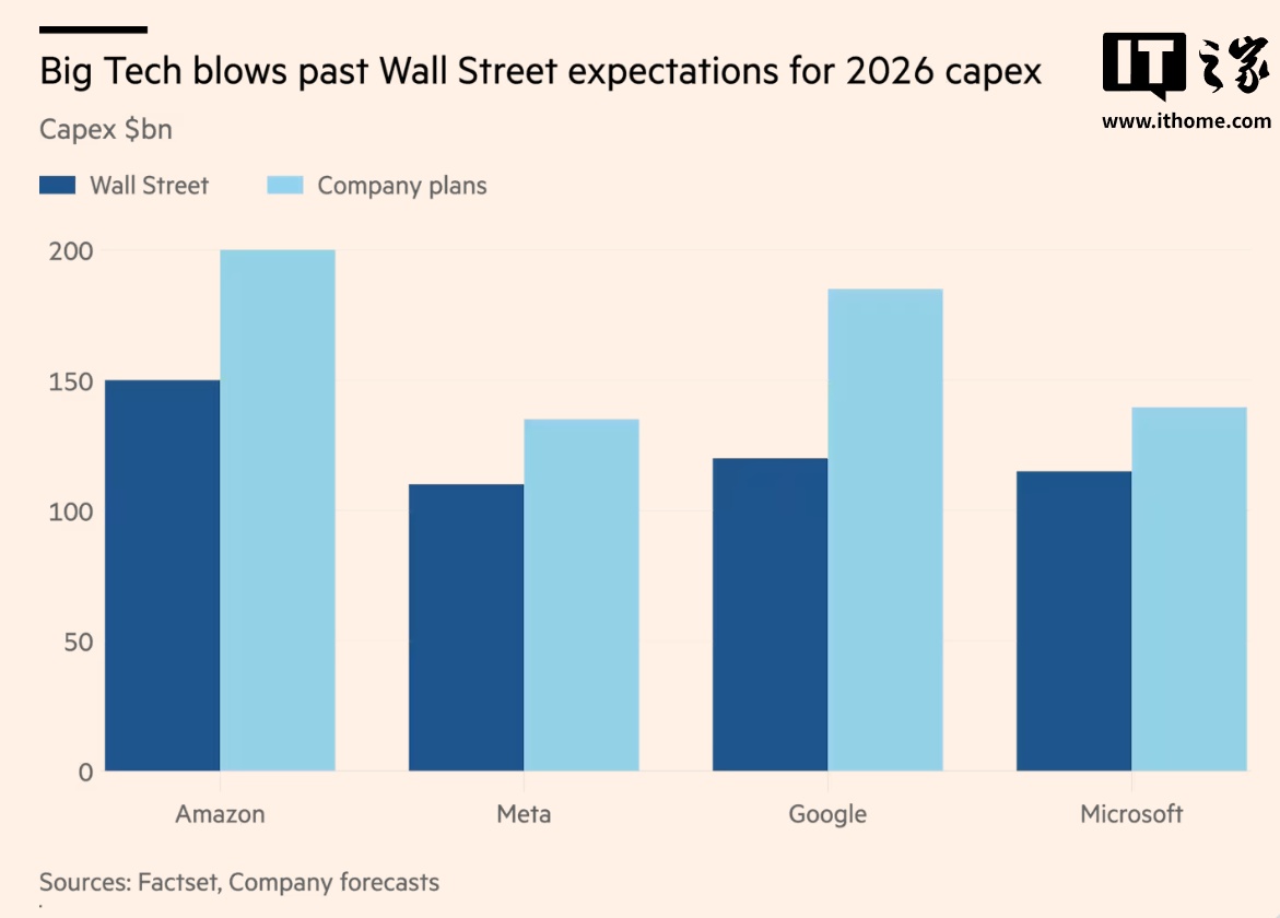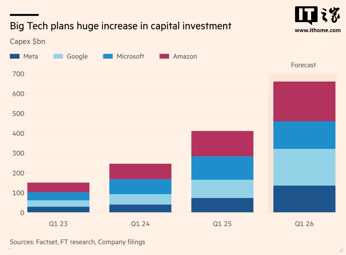 IT之家 2 月 7 日音信,金融时报昨日(2 月 6 日)发布博文,报谈称为争夺 AI 霸权,亚马逊、谷歌、微软和 Meta 通告本年(2026 年)老本开销将达到 6600 亿好意思元(IT之家注:现汇率约合 4.58 万亿元东谈主民币),较 2025 年激增 60%,是 2024 年开销的两倍多。