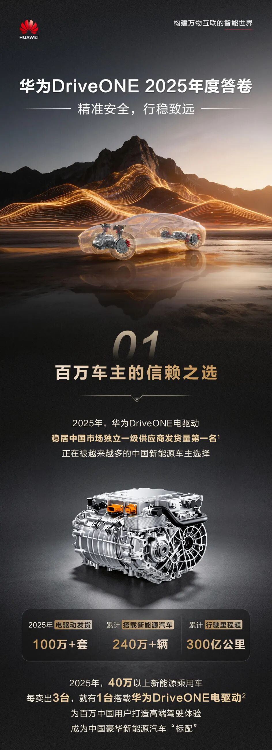 IT之家 2 月 12 日音讯,华为数字动力官方昨日交出了华为 DriveONE 2025 年度答卷:2025 年,华为 DriveONE 电启动稳居中国商场孤独一级供应商发货量第又名。